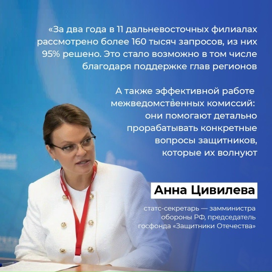 Об этом рассказала руководитель фонда «Защитники Отечества» Анна Цивилева. На Восточном экономическом форуме она встретилась с главами ДФО, чтобы обсудить поддержку участников военной операции и членов их семей.