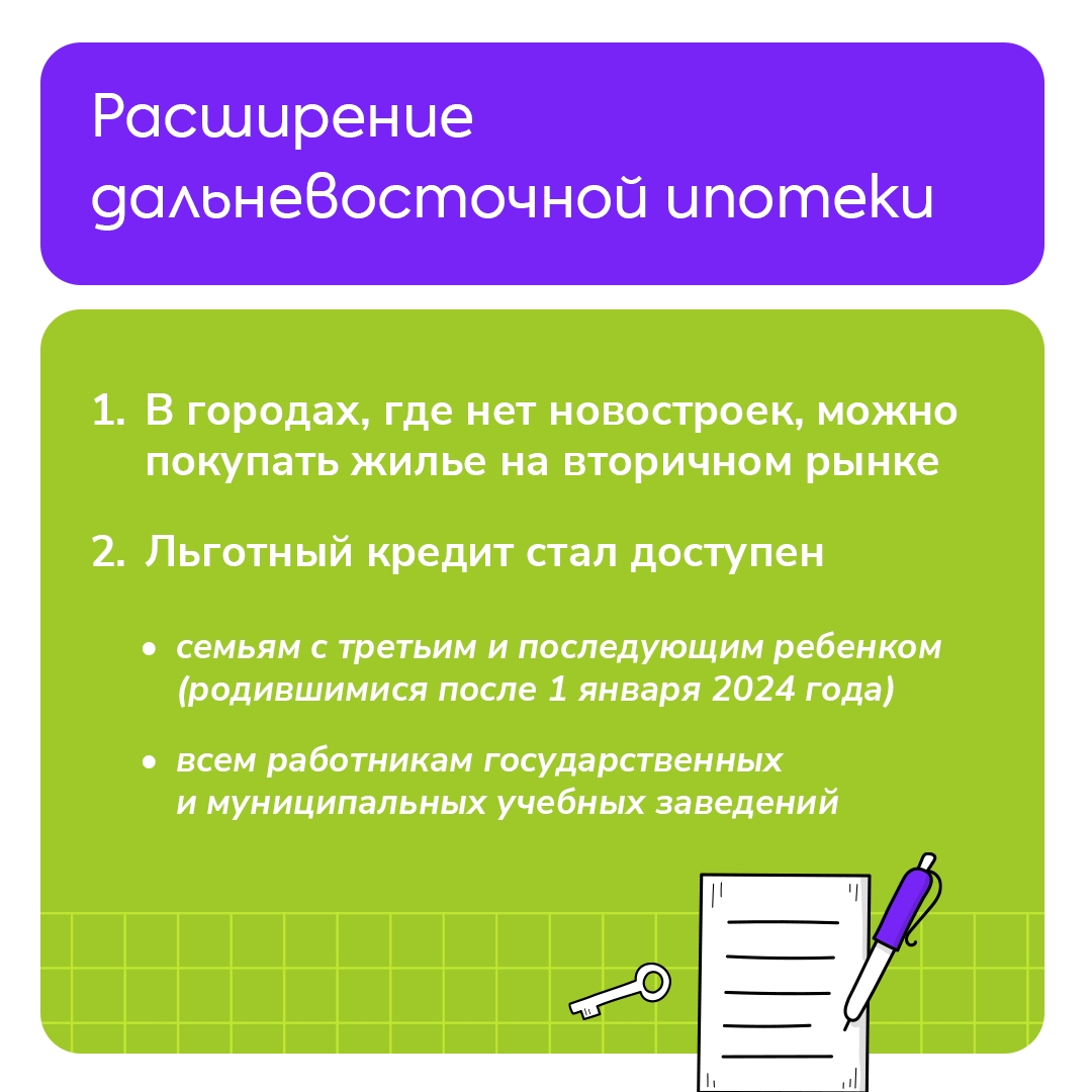 По поручению Владимира Путина расширена дальневосточная ипотека. В число льготников вошли многодетные семьи и все работники государственных и муниципальных учебных заведений.